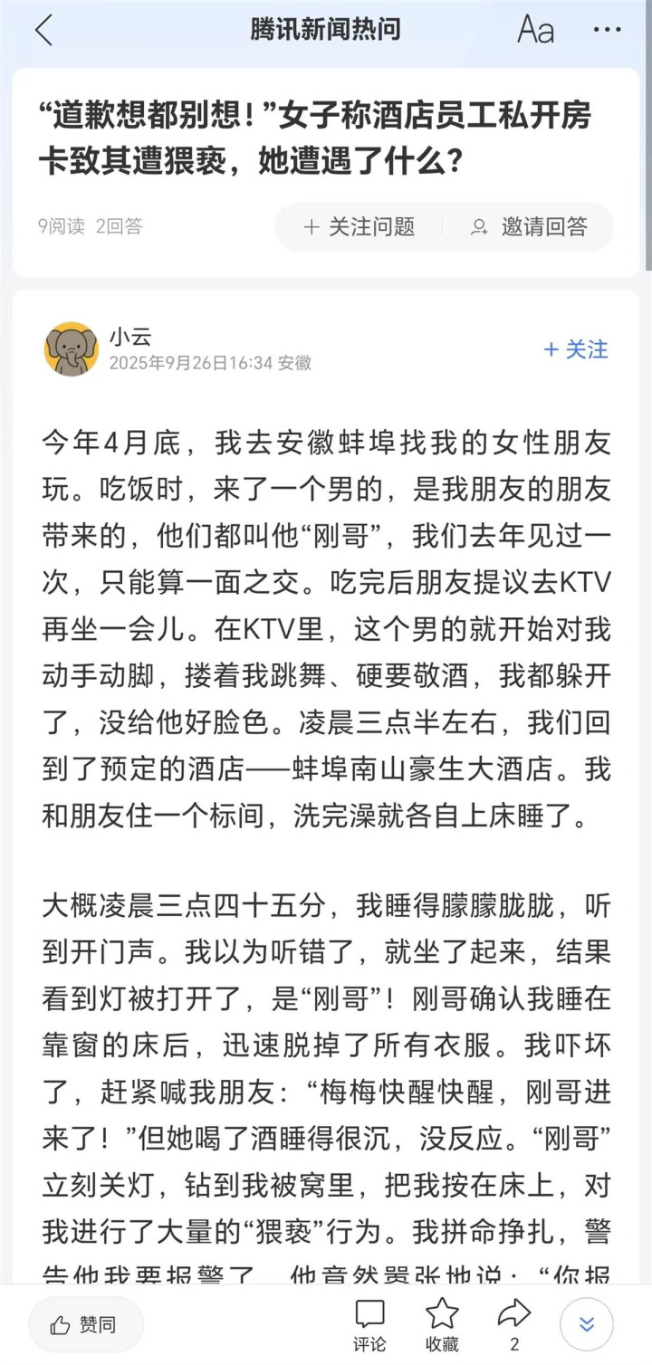 9月26日,安徽网友“小云”在腾讯新闻“热问”发声,称在今年4月和闺蜜入住蚌埠南山豪生大酒店时,一名男子从前台获取房卡后进入房间强制猥亵了她。27日,涉事酒店工作人员表示,酒店方一直在处理此事。